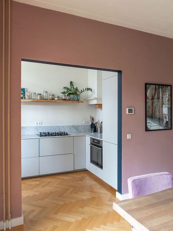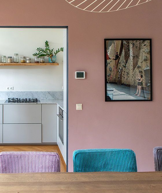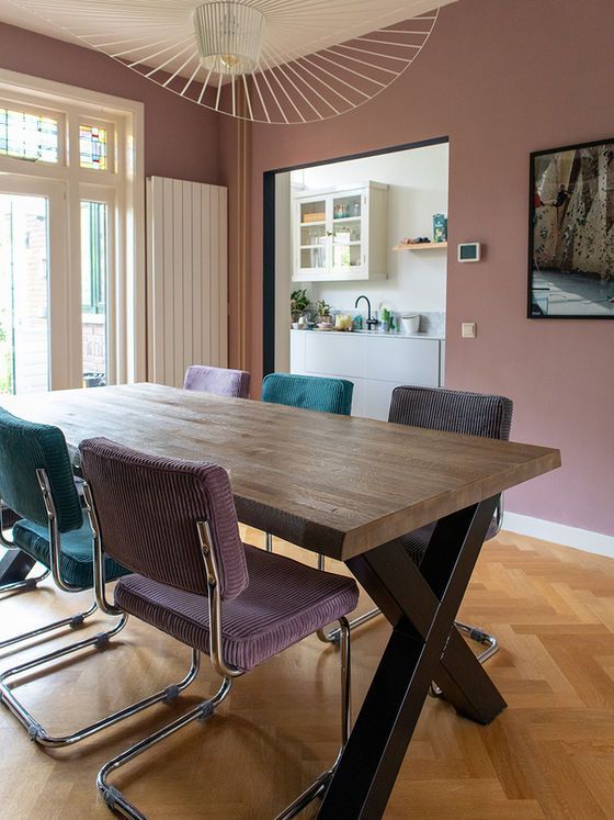 Aan de tegenoverliggende wand brengt een subtiele oudroze tint warmte in de ruimte. Deze kleur verbindt het hout en het glas-in-lood en verzacht het blauw, waardoor de eetkamer een harmonieuze en uitnodigende sfeer krijgt.