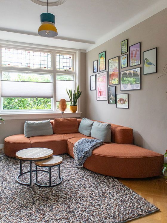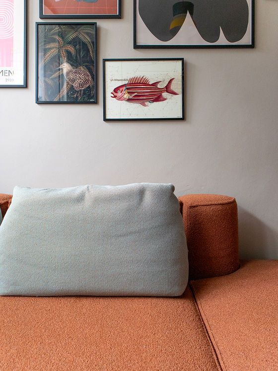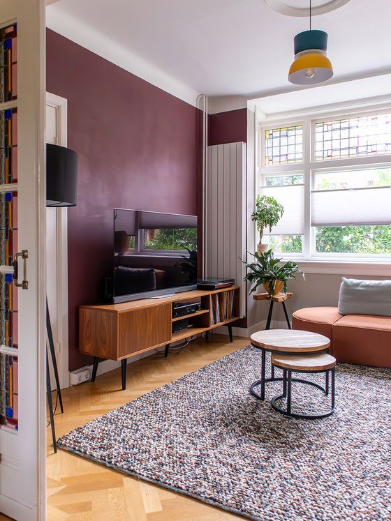 De woonkamer kreeg het thema Grafische Pop. De op maat gemaakte, modulaire sofa van Montis in oranje bouclé vormt samen met frisgroene kussens een gedurfd en energiek statement. De tv-wand is uitgevoerd in een diepe merlotkleur, die prachtig contrasteert met het vintage midcentury meubel voor hun mediahobby’s.