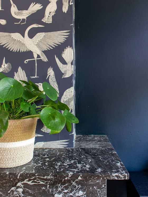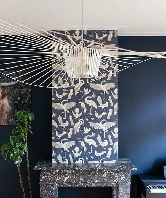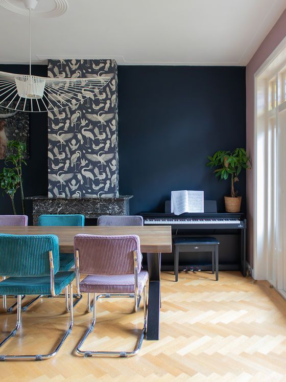 De eetkamer kreeg het thema Classic Naturalis. De schouw is bekleed met het verfijnde vogelbehang van Ferm Living, dat naadloos aansluit bij de diepe blauwe achterwand. Door deze eenheid in kleurdiepte ontstaat een rustig en geborgen geheel.