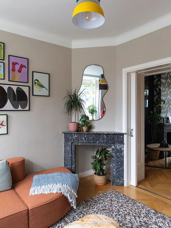 In de hoek staat een klassieke marmeren haard, omringd door weelderige planten. Daarboven hangt een organische spiegel die het licht op een zachte manier reflecteert en de ruimte optisch vergroot. Het geheel voelt uitgesproken, maar tegelijkertijd in balans.