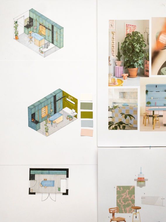 Een jaren ‘70-palet in zachte pasteltinten geïnspireerd op het pallet van Le Corbusier. Een strakke en opgeruimde uitstraling, dus veel opbergruimte!